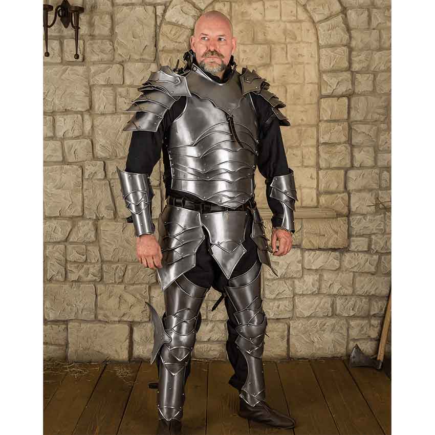 Become a mighty knight at your next event when you wear the Rikomer Armour Set. This bundle has a great fantasy-inspired design. To begin with, this armour set includes all of the steel Rikomer armour pieces. The armour is made of 18-gauge steel, so it is great for LARP and costume use. The pieces cover the body from the neck to the ankles as well as the forearms. They secure with leather straps. Many of the pieces have an overlapping design with pointed edges.
