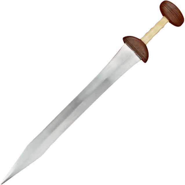 The wooden gladius-style guard is brown with two grooves at the top. With a grooved handle made of carved bone, you can achieve a secure one-handed grip. Like the guard, the threaded brown pommel is also made of wood with grooves in it for added detail.
