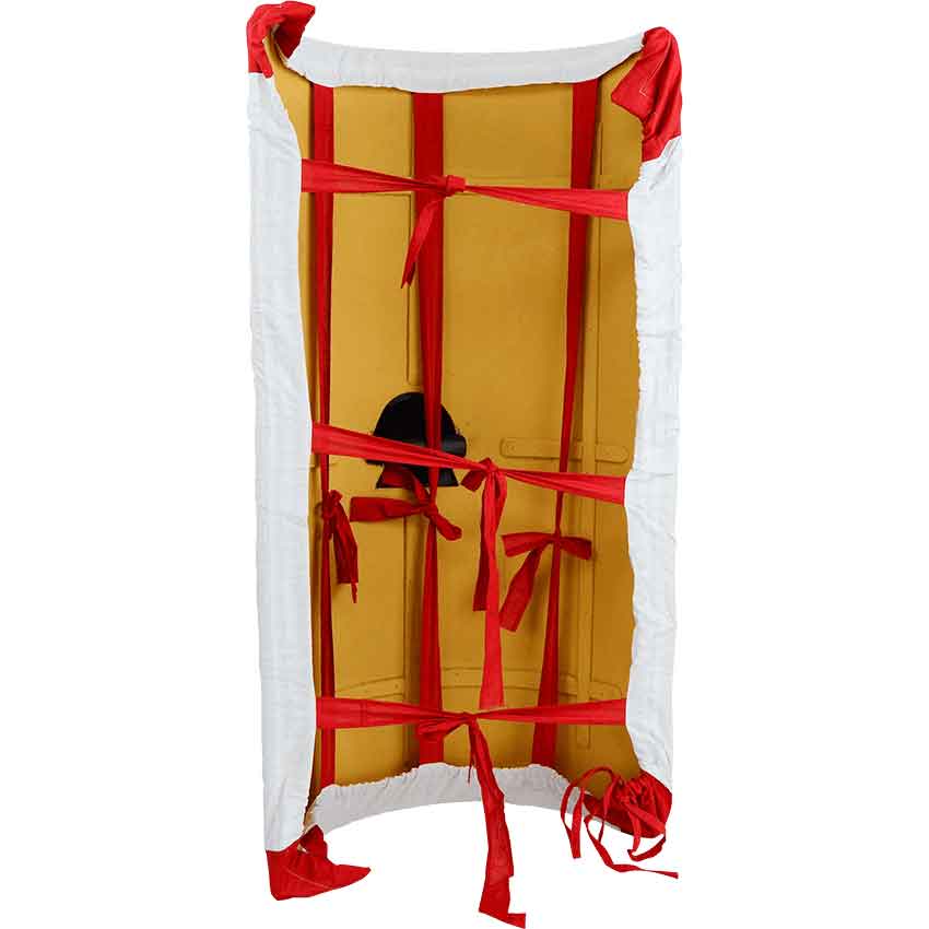 It would be a shame for your Roman shield to see wear and tear when it was not in use. Better to cover it up and save it for the battle, we think. And to do so, we offer this Roman Scutum Shield Cover, for protecting your shield when it is idle. The cover is made entirely from heavy fabric, which is ornately adorned with a bright red circle, ringed by a partial square covering over it. The fabric serves the dual purpose of keeping your shield from prying eyes, while also protecting it from the elements, ensuring that when not in use, it is not exposed to the elements. And even when you march onto the field, you can keep your shield covered and safe, only removing the cover before battle, so that even the elements and the weather at large can do no damage to your scutum. After all, you do not wield the scutum to defend you from the elements, but instead, to defend you from your enemies! And this Roman Scutum Shield Cover ensures that you can protect your scutum, so that when the time comes, your scutum can return the favor and protect you, too.