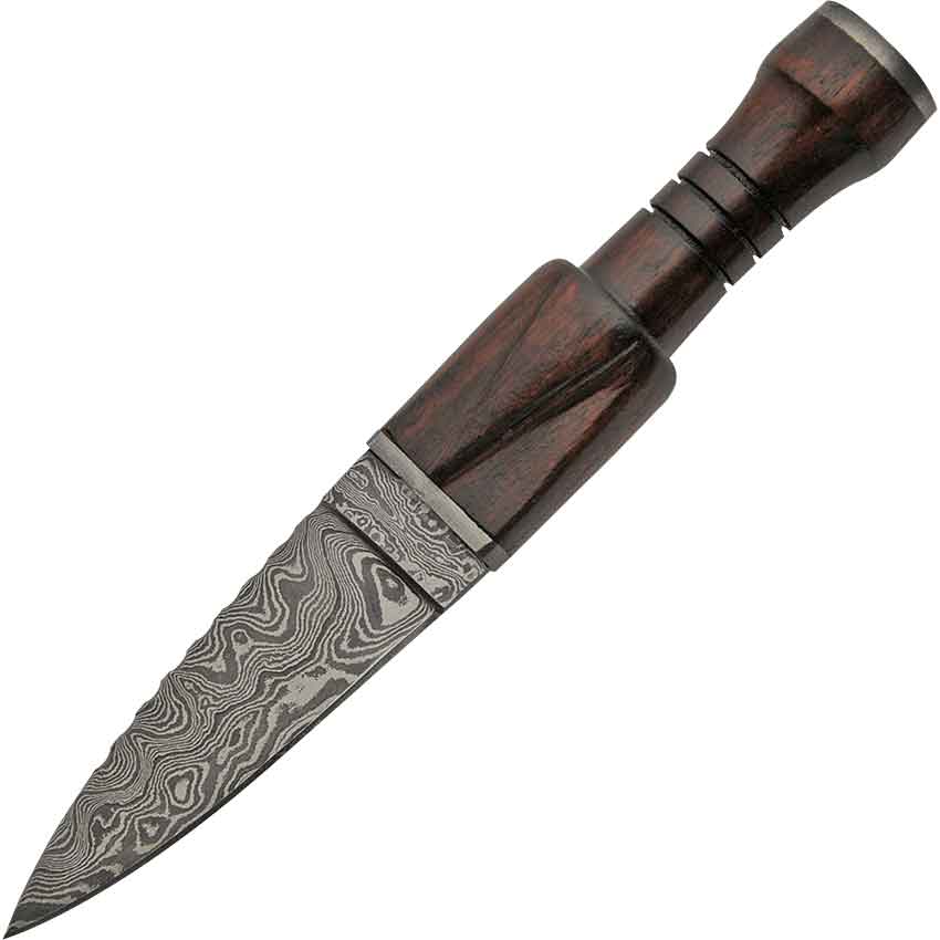 In Scottish tradition, a small knife was tucked into the sock for the cutting of food at dinner time, but it also served well as a weapon of defense. This traditional tool has been recreated by the Rosewood Sgian Dubh. This knife is made from Damascus steel, granting it both a beautiful water-ripple pattern as well as a high degree of durability. Its spear-point blade is double-edged, with one side featuring jimping. The hilt of this knife is made from dark brown rosewood, adding to its appeal, and its circular shape makes gripping easy. Though meant to be tucked into a sock, this sgian dubh comes with a wooden scabbard with a leather belt loop, so it can be worn within reach. The Rosewood Sgian Dubh is the perfect knife for anyone looking to complete their highland ensemble or get in touch with their Scottish heritage, and it is sure to serve with strength.