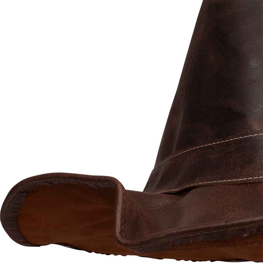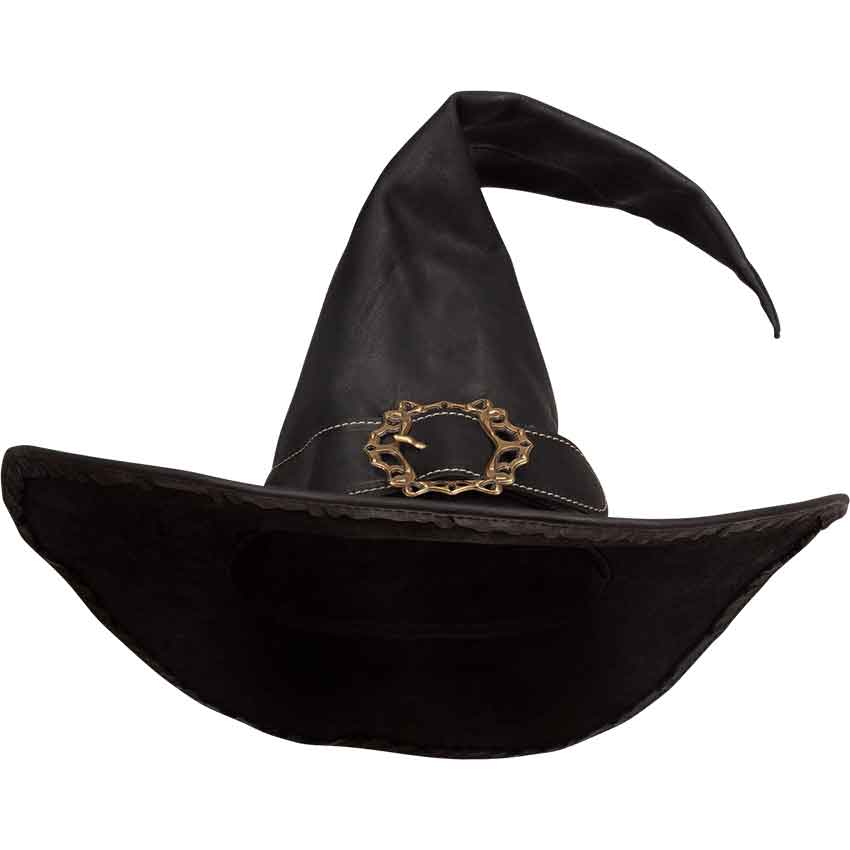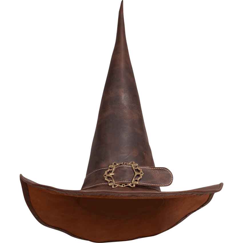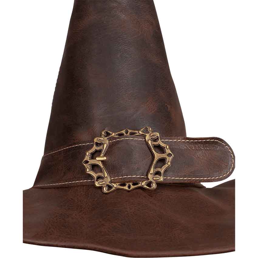 Made from leather, this medieval witch hat comes in two colors and three sizes. In the center, it features a tall, pointed crown. A band wraps around the base of the crown. It has a brass scrolled buckle on the band.