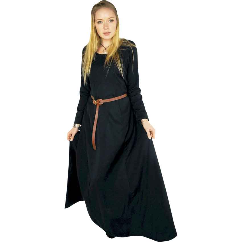 Made from 100% viscose, this black Norse dress comes in seven sizes. It has a rounded neckline and long, straight sleeves. There is a central panel with princess seams at the bodice. The Viking dress has a loosely cut A-line skirt.