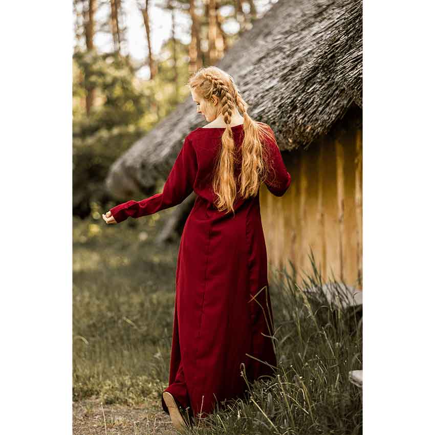 Made from 100% viscose, this vibrant red Norse dress comes in seven sizes. It has a rounded neckline and long, straight sleeves. There is a central panel with princess seams at the bodice. The Viking dress has a loosely cut A-line skirt.