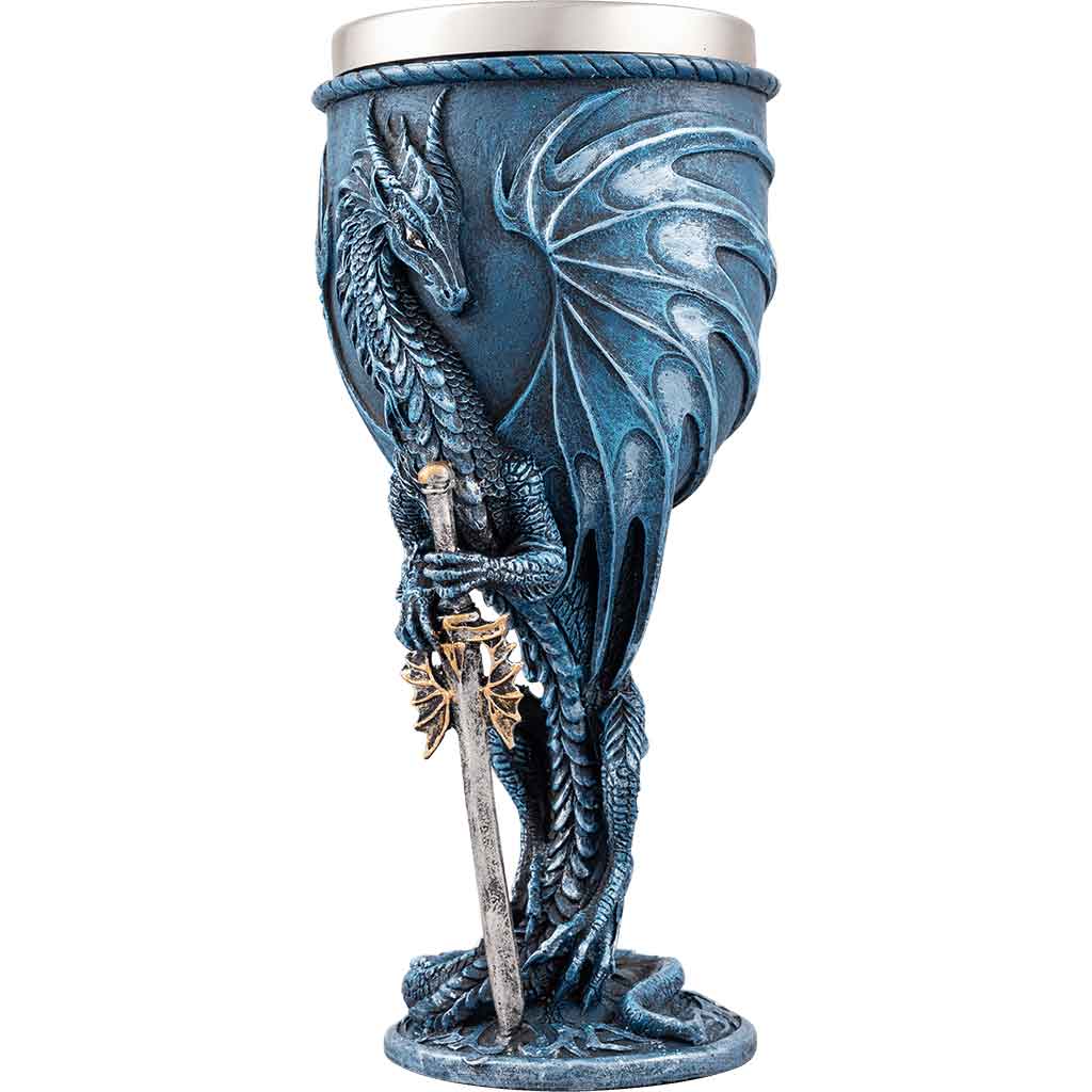You wish to claim the legendary sword for yourself so that you can rule the seas. The Sea Blade Dragon Goblet reminds you of your personal quest. Made from cold cast resin, the hand-painted goblet features a blue dragon with a blue background. It is holding onto a sword as if guarding it. The dragons wings and upper body cover the cup of the goblet. Above the dragon is a spiraled cord border. The lower half of the intricately detailed dragon forms the stem and continues onto the base. Its tail curls around the base. Intricate scrollwork also adorns the base. The sword has a unique, brass-colored handguard. It also has an antiqued finish. Finally, the fantasy goblet has a steel insert, making it drink-safe. The Sea Blade Dragon Goblet makes a wonderful drinking glass or decor item. Display it in your home or office.