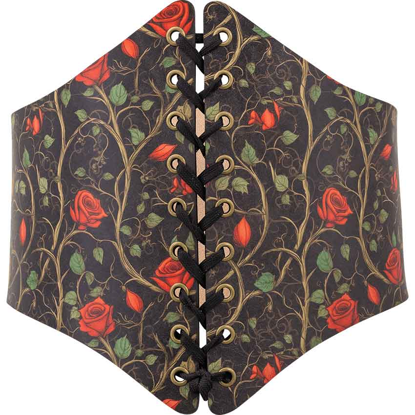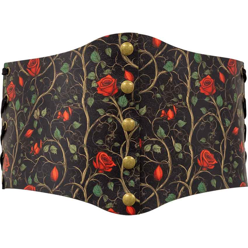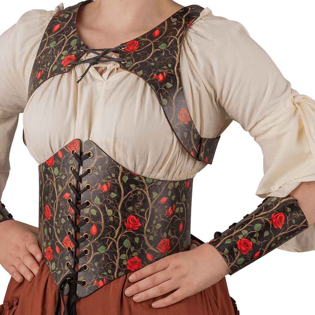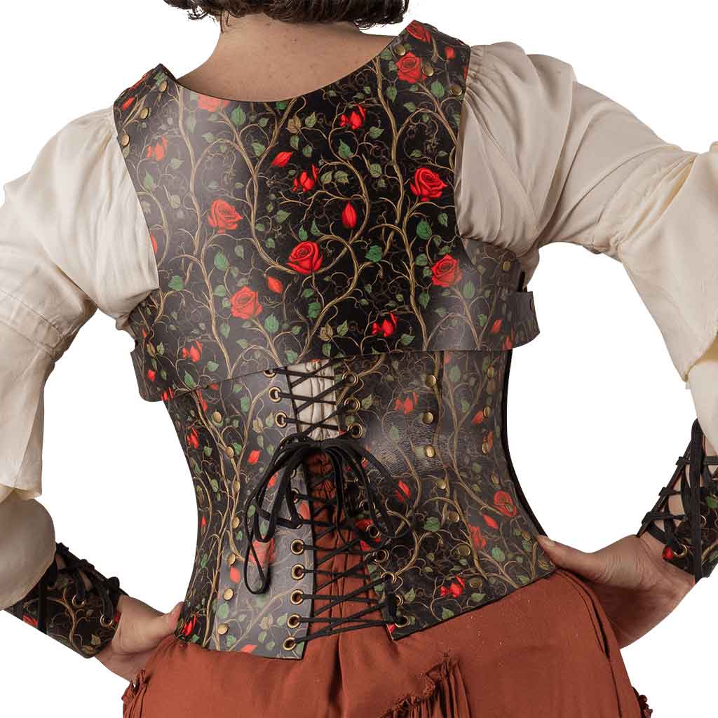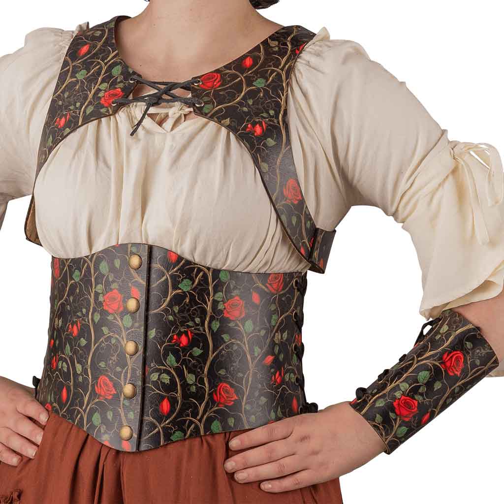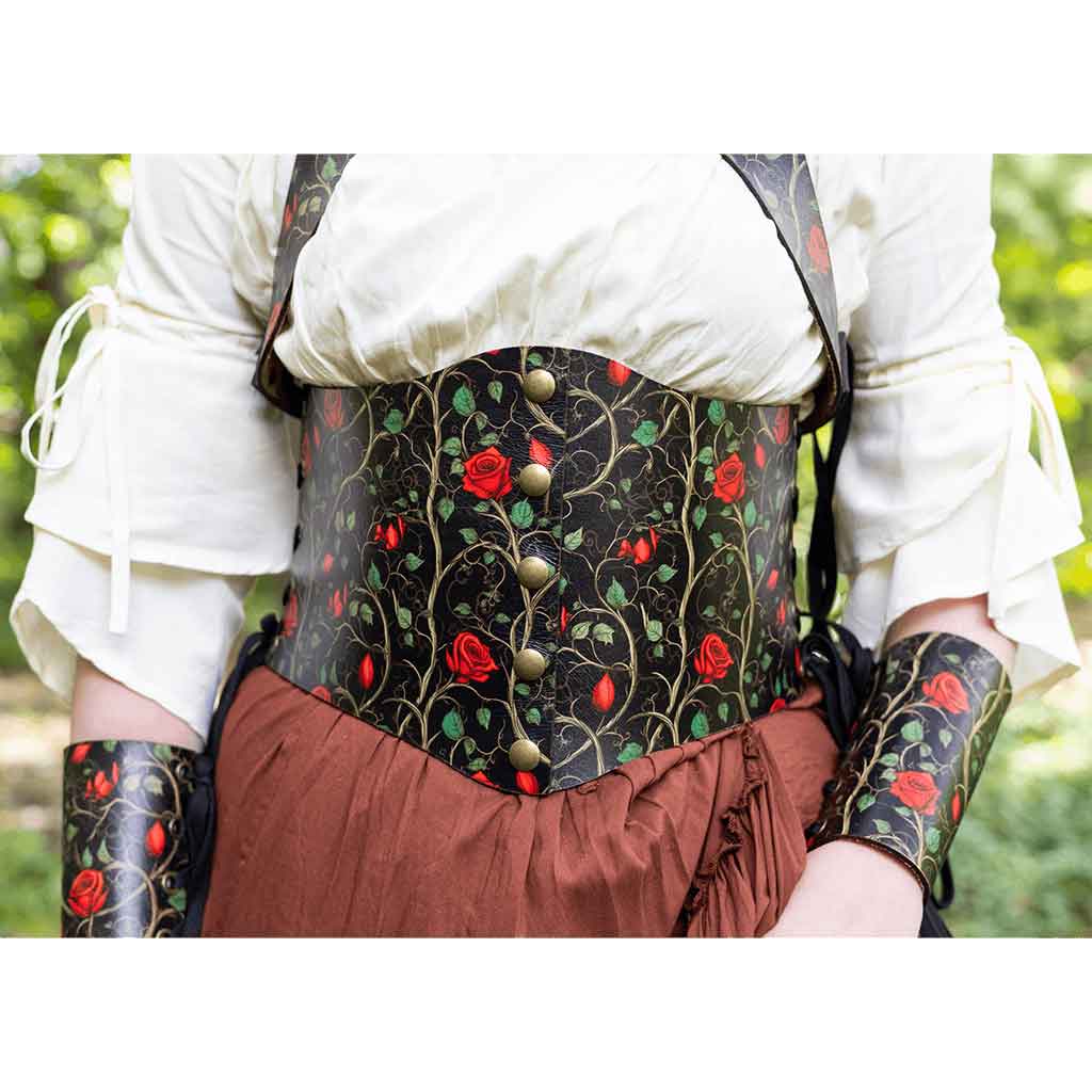Each piece in this bundle is made by hand, showcasing a true passion for artistry and quality. The designs depict roses, vines, and leaves scattered across a black background. Like a carefully maintained garden, these natural patterns have unique designs that distinguish them and add layers of detail to the costume. Red roses in various stages of bloom are complemented by green leaves and light brown vines. All the hardware is antique brass, perfectly complementing the red and black garden pattern.