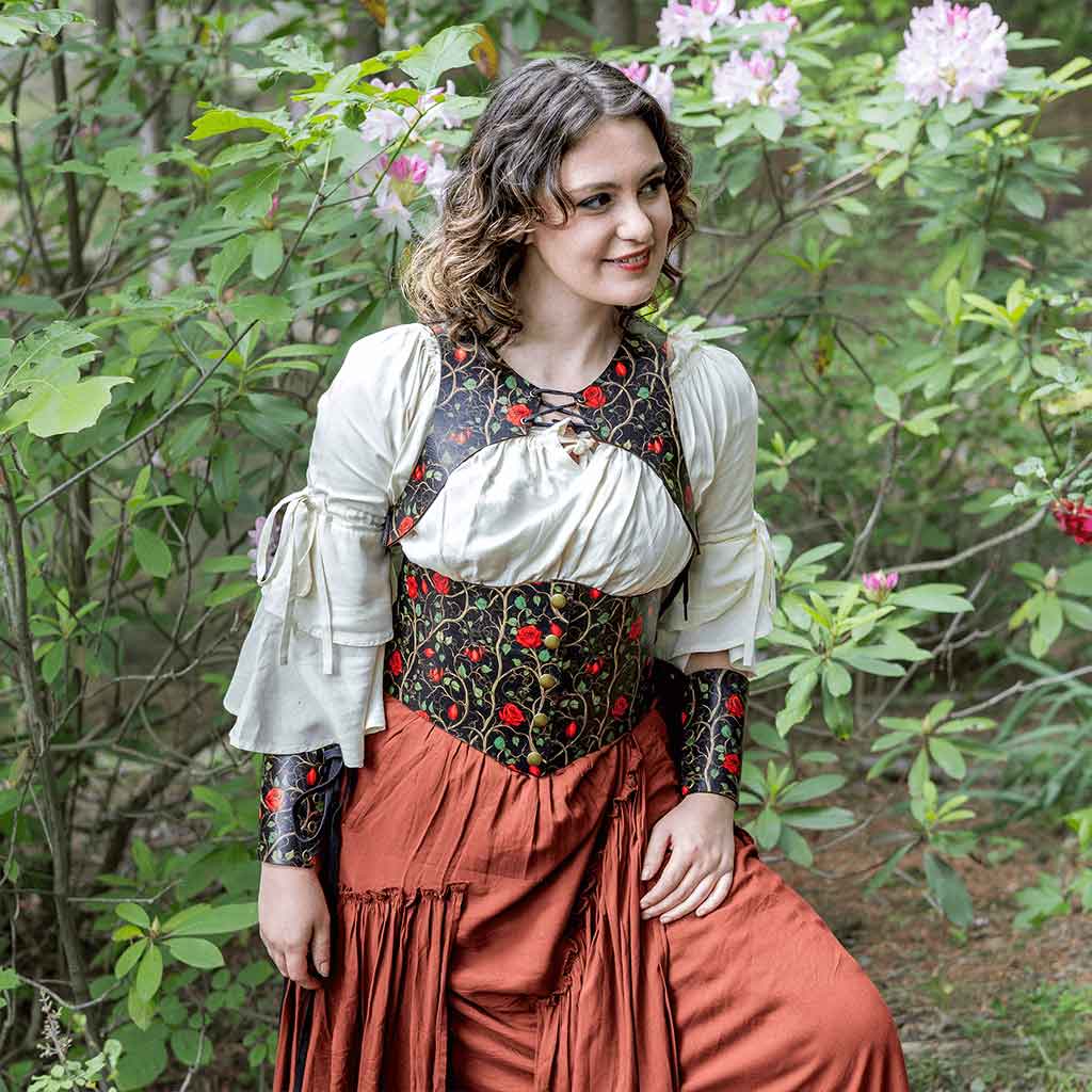 Whether you’re embarking on a fantasy adventure or looking for a stunning outfit for your next costume party, this women’s medieval outfit is great for most occasions. Adopt a medieval fantasy look for epic LARP events, charming those around you with this women’s medieval fantasy costume. You can embody the role of a whimsical maiden or fairytale lady wearing this women’s dark rose costume. Or step into a bustling Renaissance faire in this fantasy leather costume and watch as it turns heads and sparks conversation.