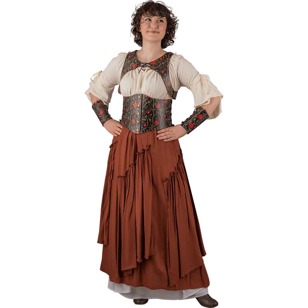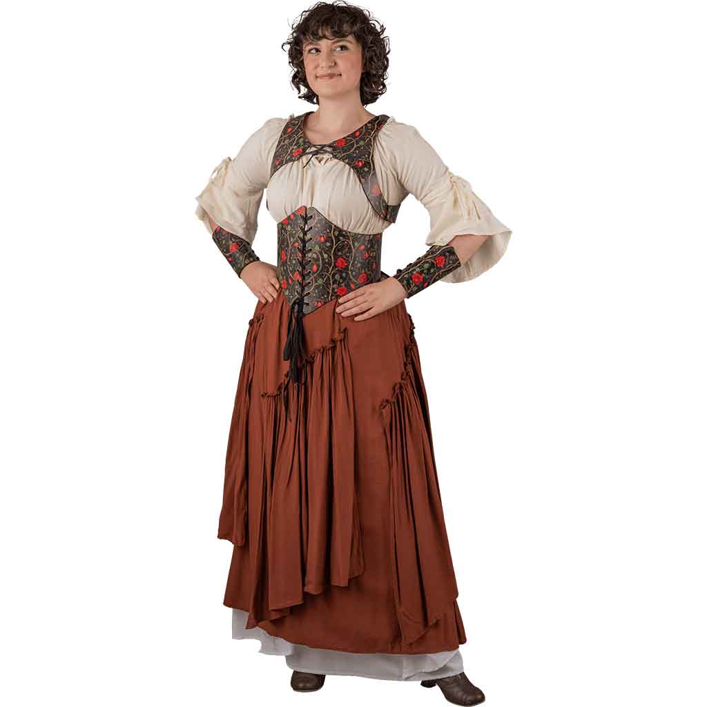 But what really sets this women’s outfit apart is its near limitless style possibilities thanks to its optional accessories. Wear the Secret Garden Leather Corset, Snap Front Waist Cincher, or Leather Waist Cincher around your waist for a complete elegant look. Show off these stunning fantasy rose leather accessories wearing the eye-catching and magnificent Womens Renaissance Peasant Blouse as a base layer. Pair that with the Renaissance Tiered Skirts and you’ve got an elegant and comfy look that turns heads wherever your adventures lead. Even better, each optional item can be personalized to bring out the best of your outfit. Whether you’re adopting a new style or attending bustling fantasy events, you can be the stunning center point wearing this women’s medieval fantasy leather costume.