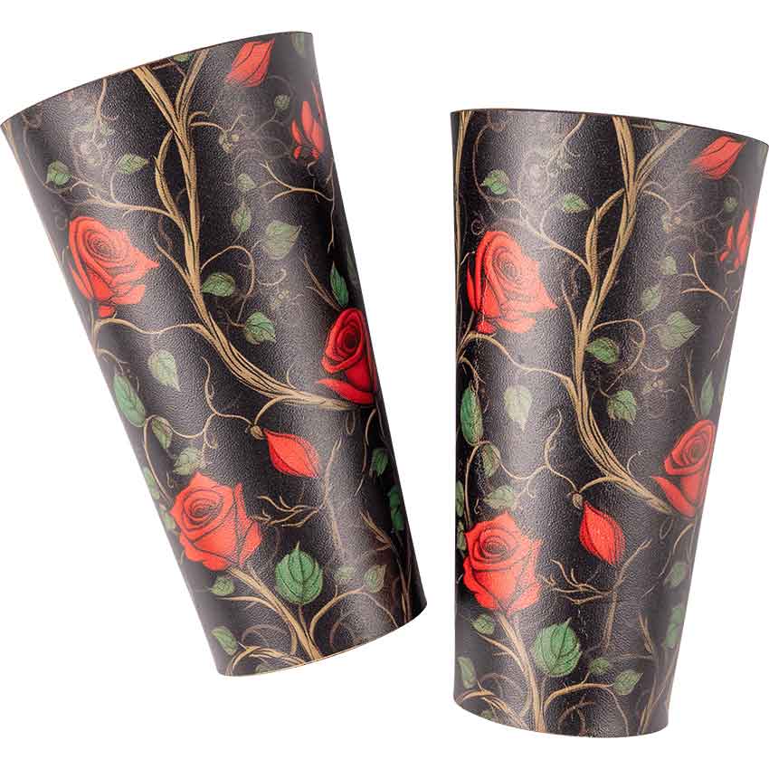 Crafted from vegetable tanned leather, right here in the USA by Dragon Forge Leather, these bracers feature an elegant design and are useful arm protectors. The design depicts roses, vines, and leaves scattered across a black background. Like a carefully maintained garden, these natural patterns have unique designs that distinguish them and add layers of detail to the bracers. Red roses in various stages of bloom are complemented by green leaves and light brown vines. All the hardware is antique brass, perfectly complementing the black and red garden pattern.