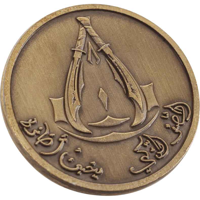 One side depicts two stylized scimitars facing away from one another with embossed designs in between. Below the scimitars is intricately carved Arabic-inspired writing. On the other side of the coin, there is an embossed, stylized Middle Eastern palace. The palace has domed towers at the top, textured pillars, and intricately carved stairs for added detail. Four concave angles form the border of the palace’s profile.