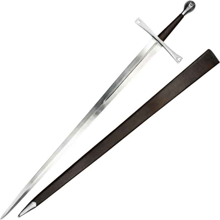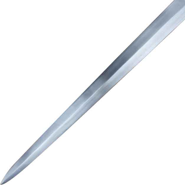 Stepping onto the field, your destiny awaits you. Lifting the Shrewsbury Hand and a Half Sword, you ready yourself for the first attack. Made from C60 high-carbon steel, this functional arming sword features a double-edged, unsharpened blade. It has a central ridge with a fuller running along a third of its length. The archers sword continues with a cruciform crossguard. The quillons thin out at the ends. They are also slightly wider, creating a somewhat bow-shaped design. Cross cutouts adorn the guard.