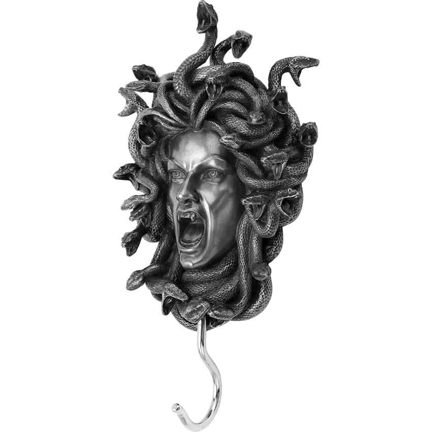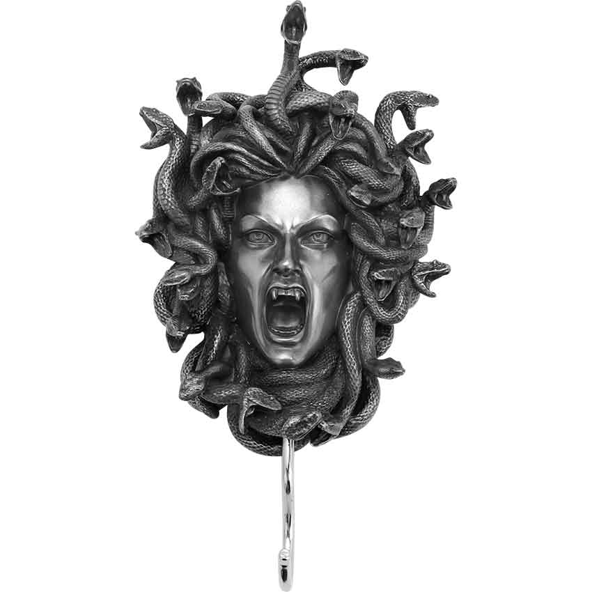 Taken from the tales of Ancient Greek, the Silver Head of Medusa Wall Hook is sure to bring a frightening look to any space. Made from cold-cast pewter, this hand-painted wall hook depicts the silver-colored face of Medusa framed by her snaky hair. She faces forward, looking towards the viewer. Her mouth is open, revealing her fangs. The mouths of the snakes are also open. At the bottom of her face, there is a metal hook. This Greek wall hook allows you to hang a garment or another item. This Medusa wall hook makes a great addition to any home or office for a touch of mythic style.