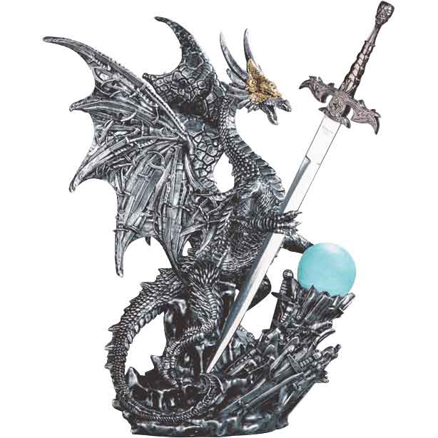 Made from cold-cast resin, this dragon statue invites you to explore it’s hand painted majesty. The design depicts a silver dragon with wings made of swords holding a functional letter opener sword. The dragon has realistic carved features like silvery scales, slightly curved horns, and fearsome claws. Its head is adorned with a golden helmet that has intricately carved patterns. The wings are furled behind it as if the dragon is about to take flight. Made of fused swords, each with unique styles, the wings add a fearsome presence to the design.