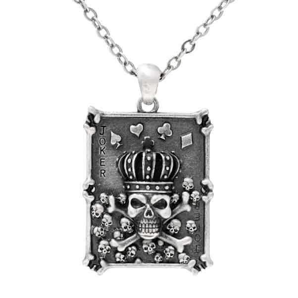 The Skull Poker Necklace is a fantastic personal accessory that features gothic style in a card shaped pendant. This fantastic necklace is made from lead free metal and depicts a royal skull against a gray metal card. This card pendant features a skull wearing a decorative crown. Under this main skull is a pair of crossed bones, as well as a number of smaller skulls. A spade, heart, club, and diamond are shown above the crowned skull, while the word Joker can be read in the upper left and lower right corners. This attractive necklace features a cast metal appearance in all gray and includes an attractive silver chain. The Skull Poker Necklace is a great personal accessory for any gothic gambler, serving to add a personal touch of style to virtually any look or attire.