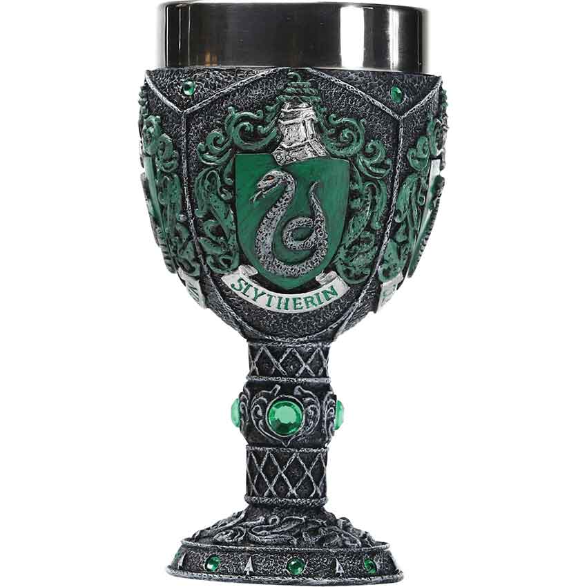 If you are a part of the sneaky, cunning, and ambitious house of Hogwarts, then you should surely toast its founder with the Slytherin House Goblet. Made from resin, this hand-painted goblet features the Slytherin crest. The crest depicts a silver snake inside of a green shield. Surrounding the shield are green floral patterns. A helmet sits above the shield while the Slytherin name rests below on a white banner. The rest of the goblets cup has a dark grey color which continues onto the stem. Faux green gems adorn the stem as well as the circular base and parts of the cup. Finally, the Slytherin House Goblet has a stainless-steel insert which makes it safe for drinking. Enjoy your favorite beverage from this officially licensed goblet or add it to a Harry Potter collection.