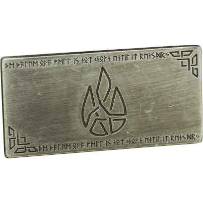 On the reverse of the bar, there is an engraved mountain range. It also has the interlocking style of the front. The reverse side also features the knotwork corners and Futhark runes. This silver bar is ideal for anyone to use at a LARP event or tabletop game.