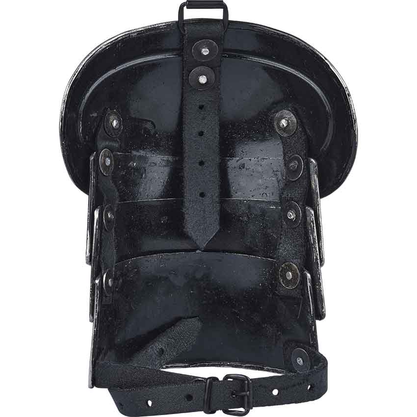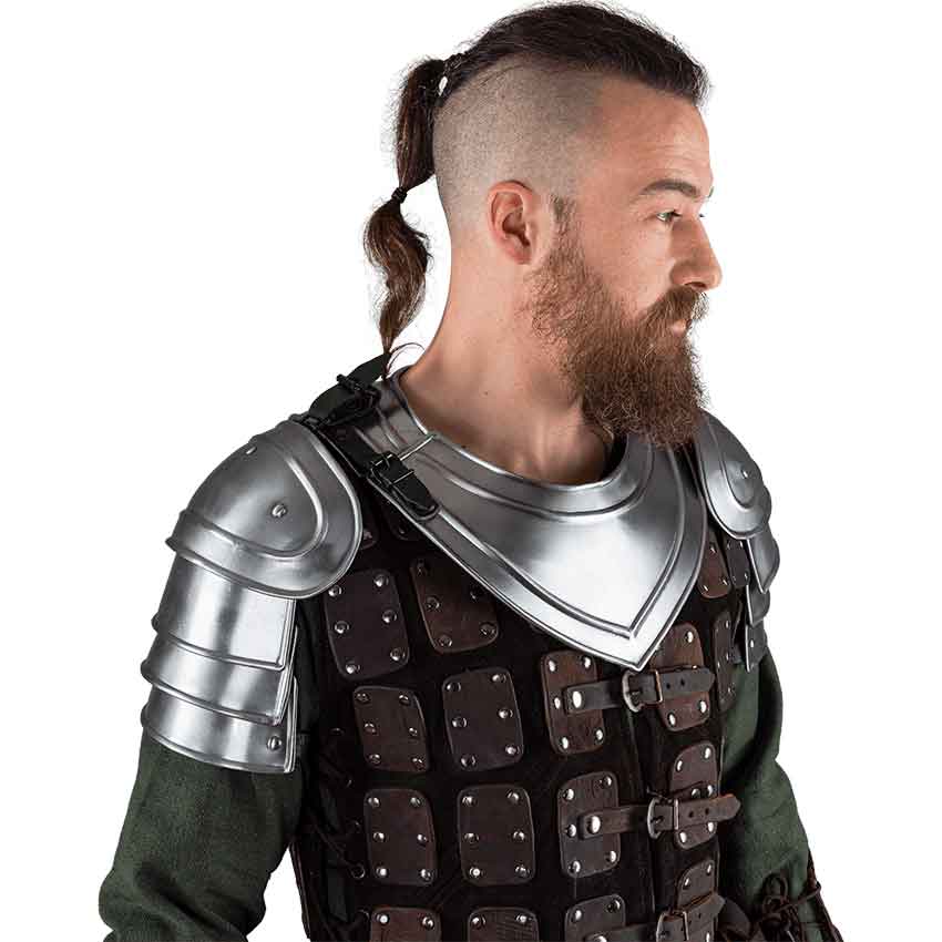 The Small Steel Adam Spaulders are well suited to being worn over chainmail or leather armour pieces. The flexible lamellae and smaller size of this shoulder armour ensure it will not encumber your movements in battle. The steel spaulders feature a bright metal finish and corrugated detailing along the rims, providing a clean, classic appearance to the LARP armour. Spaulders developed during the 1400s, making them a great way to add a medieval look to your warrior ensemble. Consider wearing these metal spaulders with a gambeson or other arming wear for increased comfort. This Adam shoulder armour easily fits with the Steel Adam Gorget (MY100048). Please note that this item must be worn with a gorget.