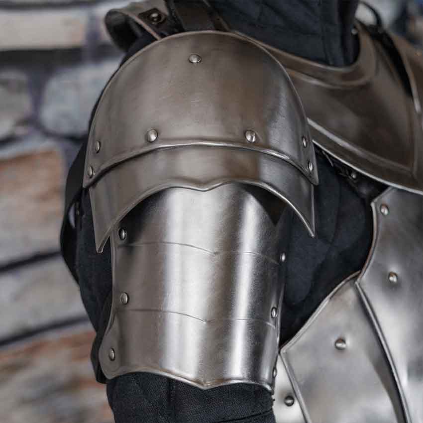 Adopt fantastic warrior style with the help of top notch plate armour like the Small Steel Markward Spaulders. These impressive steel spaulders display a bright metal finish that goes well with other medieval armour, especially our Markward-style pieces like the Steel Markward Gorget (MY100054). The strengthened design of the shoulder armour ensures it has great durability, while also offering excellent maneuverability. We recommend wearing padded arming wear with this steel armour for increased comfort. This functional armour is ideal for LARP event and re-enactments. Please note that this item must be worn with a gorget.