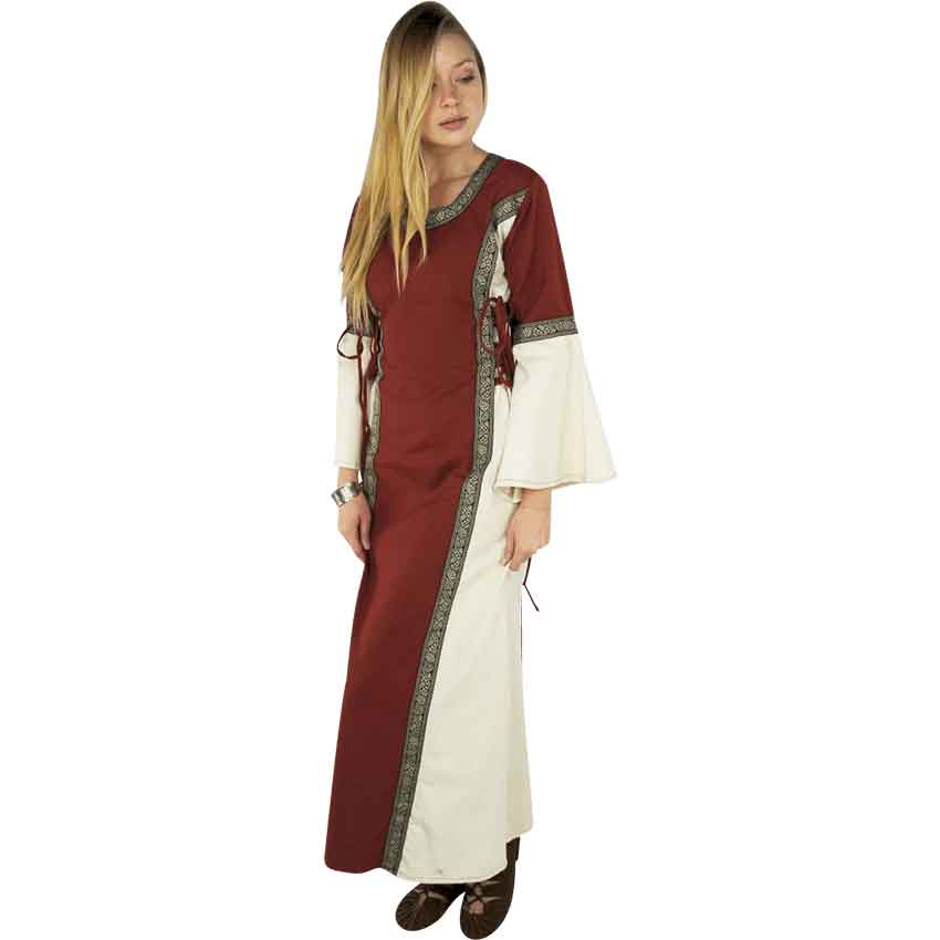 The Red and Natural Sophie Medieval Dress suits adventuring maidens, princesses, and sorceresses alike. It shows off dramatic bell sleeves and gorgeous embroidered trim. This intricate embroidered golden trim brings beautiful detail to the cotton medieval maiden gown.
