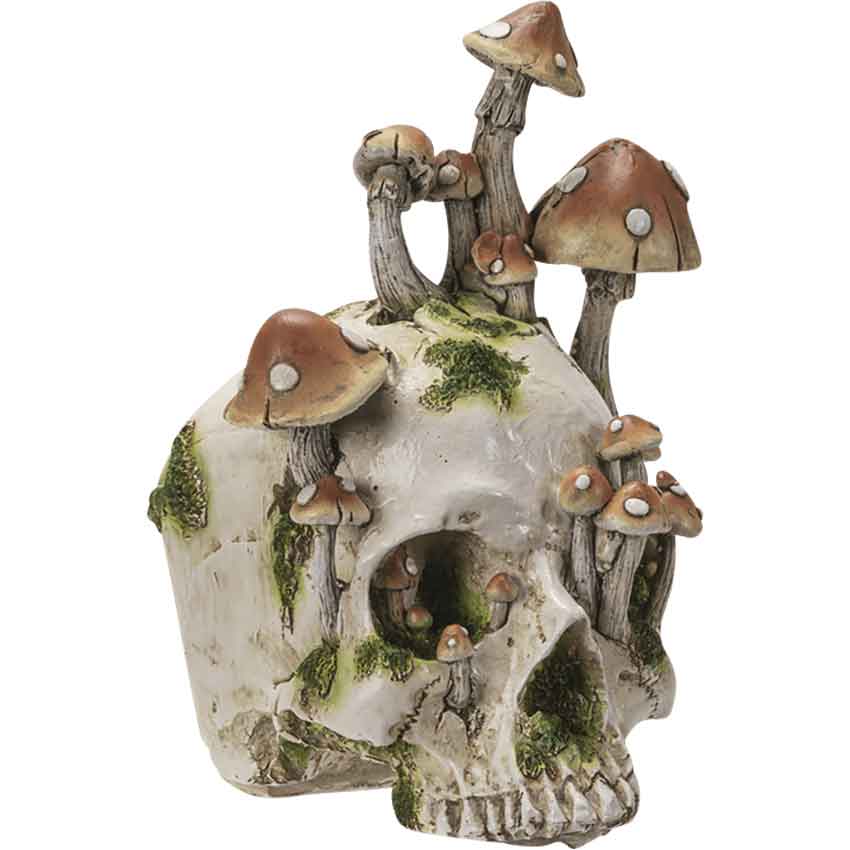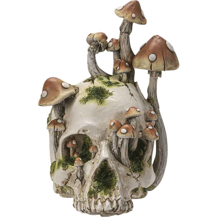 In the silent grove, the remnants of bodies lay strewn about. The Red Cap Mushroom Skull Statue peers up at you through its sprouting eyes. Made from cold-cast resin, this mushroom skull statue brings a sense of macabre nature to any witchs lair, catacomb-like home, or modern goth decor. The hand-painted skull collectible features realistic coloring and detail. Red capped mushrooms sprout out of the skull. White spots adorn the tops of the mushroom caps. Each of the mushrooms has a grey gilled stem. In addition to the mushrooms, moss creeps along the cracked, cream-colored skull. Multiple mushrooms and patches of moss peek out from the skulls sockets. The cream-colored skull rests on its upper jaw. With this piece of skull decor, you can bring some spooky style to any space.