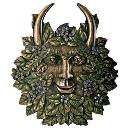 The green man is a recurring symbol in many cultures around the world, one that typically represents nature and rebirth. In this case, the Spring Greenman Wall Plaque also demonstrates a seasonal aspect, this one in particular showing a smiling face. The typical green man usually consists of a face, peaking out through some sort of vegetation or foliage, which may or may not be a part of the green mans actual face. This plaque features a green man with an incredibly jubilant expression. His smile serves only to compliment the young leaves and blooms that surround his face. Newly grown leaves decorated with softly colored purple blossoms surround this green man, making up both his beard and his hair. This green man lacks a mustache entirely. This spring-styled green man also features a pair of thin, straight, goat-like horns, which sprout from his forehead just near the eyebrows. This plaque is made entirely from cold-cast resin and has been hand-painted to display vivid color and incredible detail. The Spring Greenman Wall Plaque shows one of the green mans seasonal faces and in doing so, happily displays the growth and joy that are typically associated with spring. The Spring Greenman Wall Plaque is only one of four seasons, so check out our Greenman Section to find the rest!