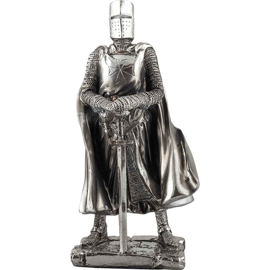 The Standing Crusader Knight Statue depicts a classical interpretation of a medieval warrior in armor standing on a base modeled on rocky ground. This knight features the garb of a medieval crusader, wearing mail armor and classic Templar robes. This warrior wears a classic flat topped great helm, along with a full suit of mail armor. Over his armor, the knight wears the simple robes and cape of a crusader, which feature a decorative cross emblem. Both of the knights hands rest on the pommel of a long sword, which rests point down. This great medieval statue is made from high quality cold cast resin, which has been hand-painted for detail and electroplated in nickel to give it a near metallic finish. The Standing Crusader Knight Statue is big on detail and small on size, creating the image of miniaturized medieval era figurine that any enthusiast or collector would gladly accept into their personal collection.