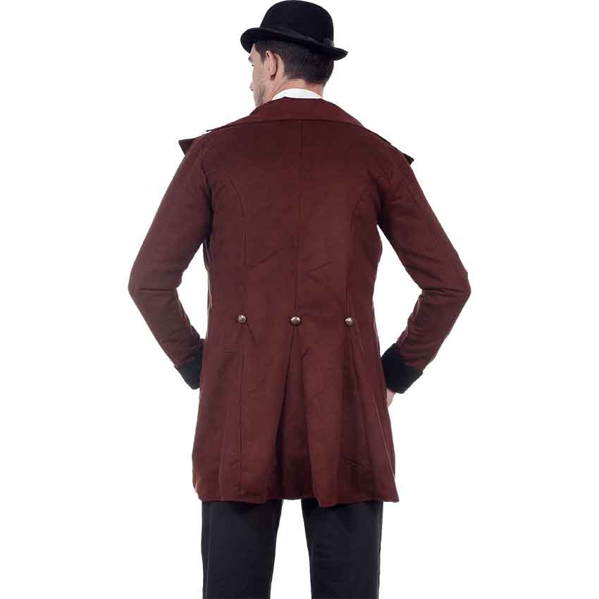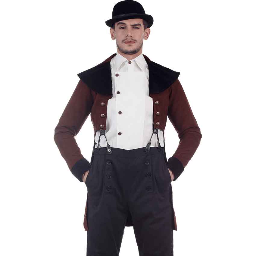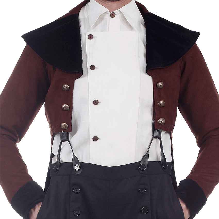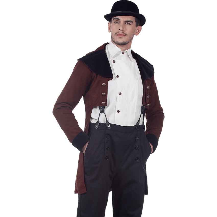 A necessary piece in the wardrobe of anyone who is a fan of Victorian era styling or the steampunk genre, the Steampunk Baker Tailcoat is designed to mimic the sophisticated and elegant styling of 19th century formalwear. As is tradition of tailcoats, in this design the front of the coat nearly reaches the waist, while the back portion stretches part of the way down the back of the thigh. Its exterior is made of exquisite chocolate colored suede for a chic look, and it is lined with satin for a smooth and luxurious interior. Three metal buttons are featured on each side of the front and three matching buttons decorate the back. Experience the styling of a true Victorian gentleman while wearing the Steampunk Baker Tailcoat.