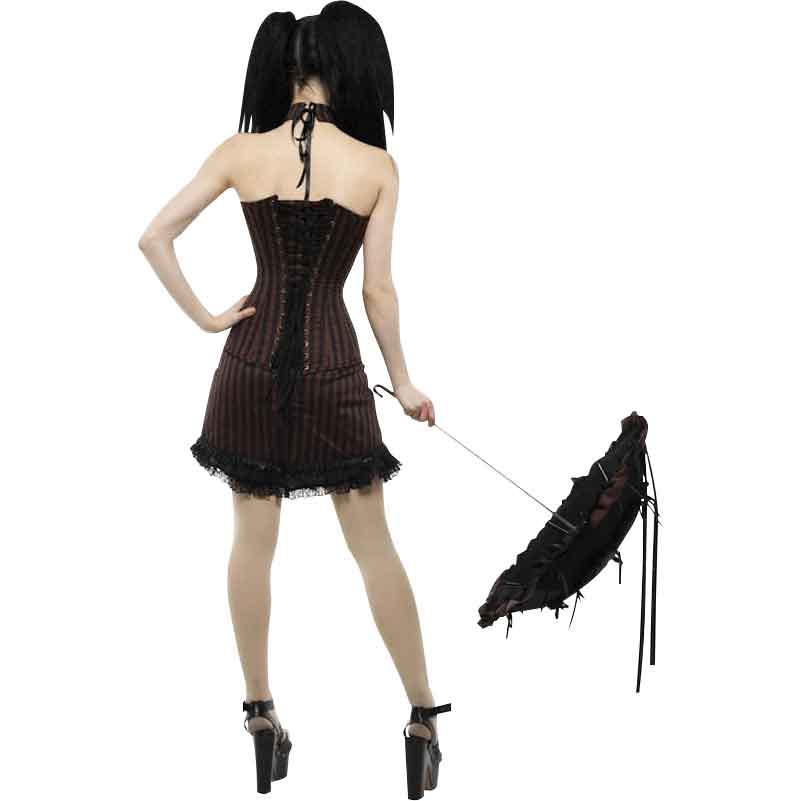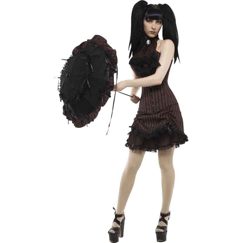 Combine this skirt with your favorite blouses to create a charming ensemble that looks playful and stylish! The Steampunk Chiffon Ruched Stripe Skirt features ruching along both sides of the front with the help of satin ribbons. An underlay of brown crinkle chiffon adds length and beauty to this piece. Black lace around the bottom hem adds another 2 inches to the length. A zipper runs down the back of the skirt for an ideal fit.