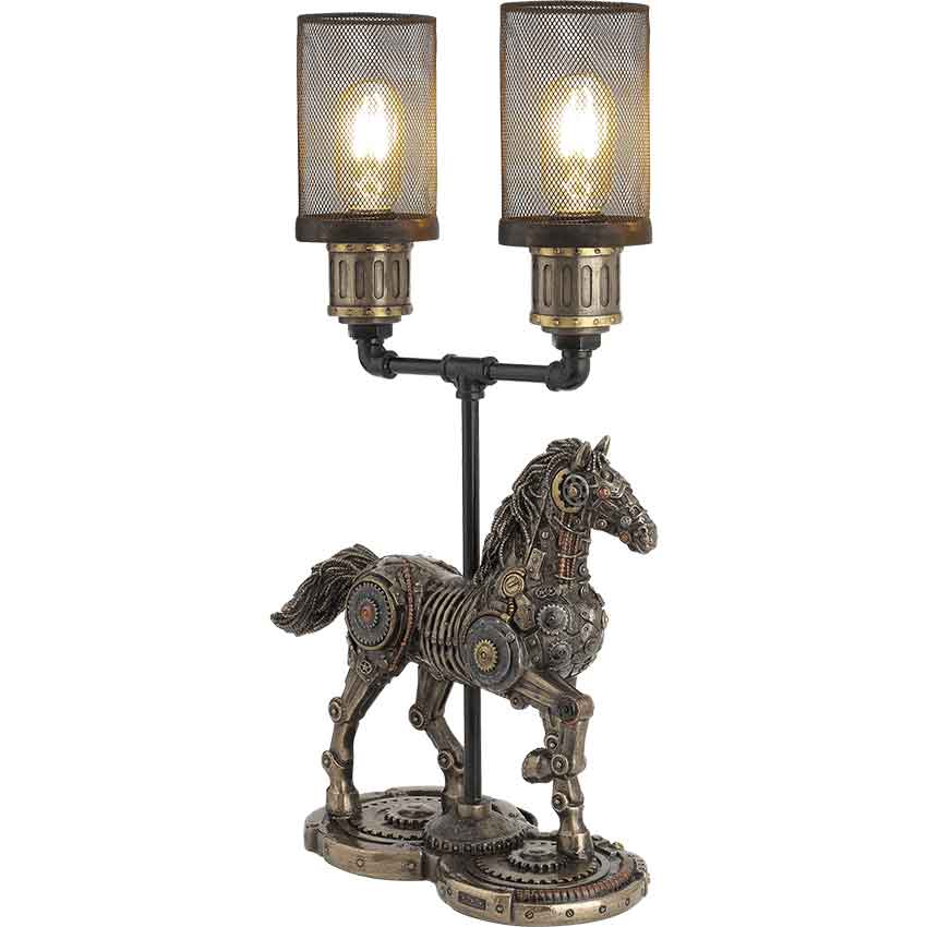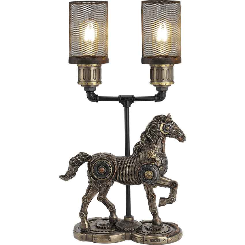 The Steampunk Horse Lamp features an imaginative steam-powered creature as its base, with gears, wires, and coils making up a remarkable mechanical horse. This statue lamp adds a bit of light to any decor as well as steampunk flair. Made of high quality cold cast bronze, the steampunk horse statue has round gears making up its base and has been hand painted to look like antique metal with brass and copper colored accents. Two twin mesh lightbulb casings are attached to a stand that goes through the center of the horse. Brimming with steampunk themed detail and useful for adding extra lighting to any setting, this steampunk decoration is an ingenious and delightful accent lamp for your home or office.
