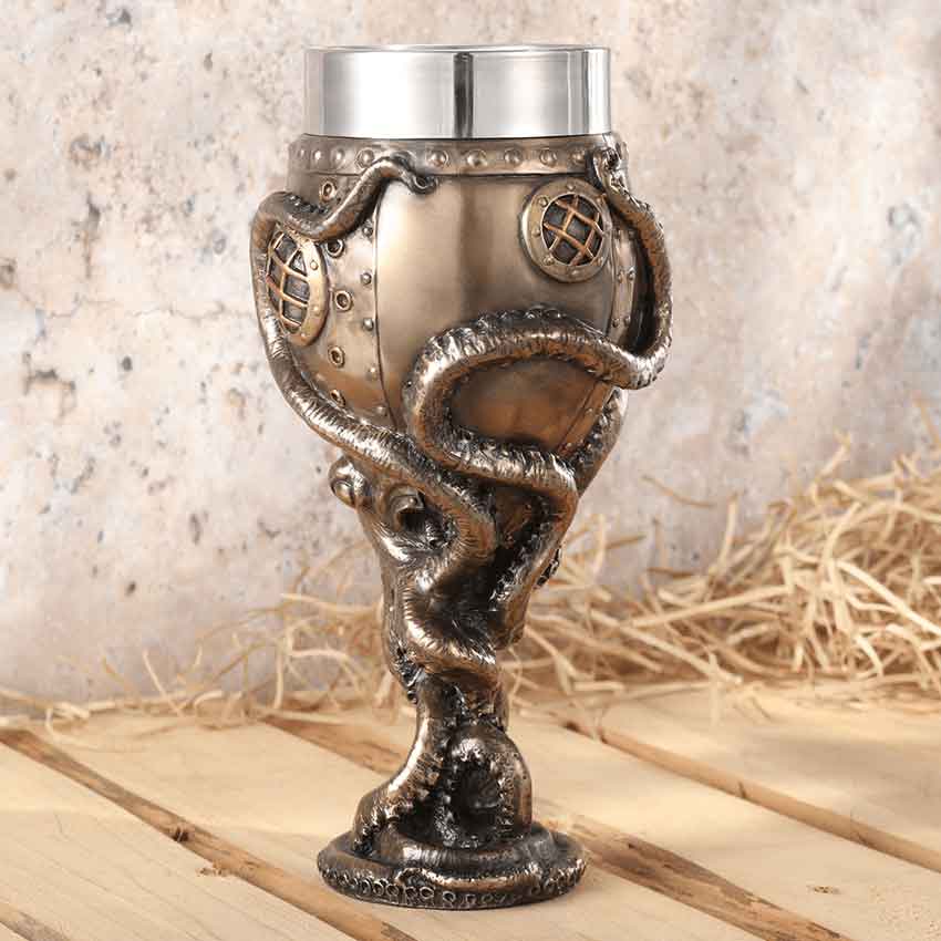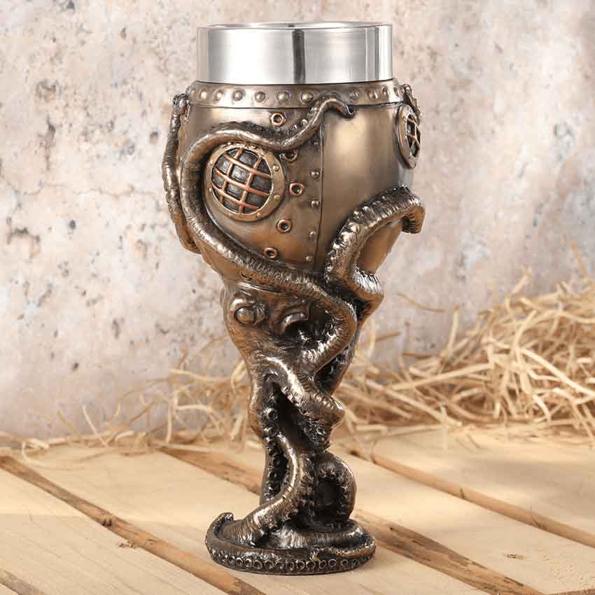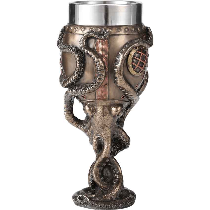 Everyone knows that the best wines are aged in oak barrels, lost in a shipwreck, and held at the bottom of the sea for a century in the tentacles of an octopus. The Steampunk Octopus Goblet is sure to make every sip an adventure. This cast bronze goblet takes the form of a diving bell, compete with rivets and a brass- and copper-colored porthole. Its stem is crafted to resemble the body of an octopus, its long and suckered tentacles reaching up to clutch the cup. This goblet comes with a steel liner, making cleaning easy, and because of the goblets material, it is recommended that it only be washed by hand. The Steampunk Octopus Goblet makes a fantastic piece of neo-Victorian drinkware that is sure to bring a bit of nautical wonder to your kitchen.