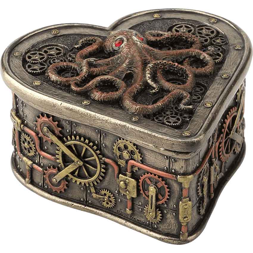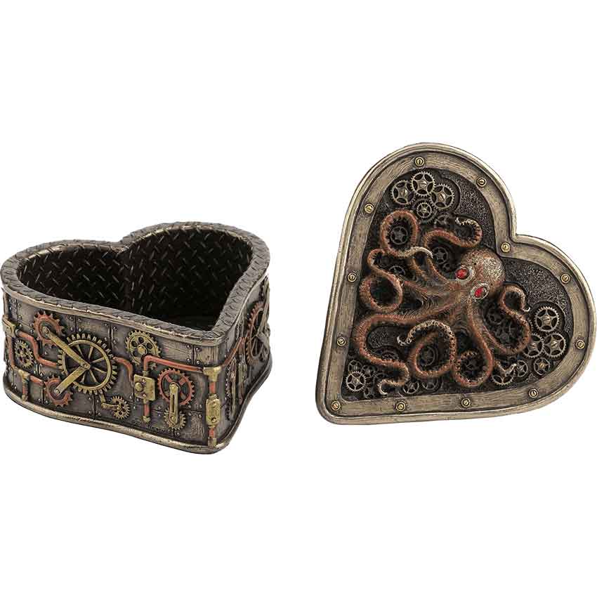 When an octopus finds a treasure, it holds on tight with all eight suckered legs, never letting its prize go. With the Steampunk Octopus Heart Trinket Box, you can put your most valuable items in the care of one of these crafty creatures. This bronze trinket box takes the classic shape of a heart, with a couple neo-Victorian modifications. Its sides have been adorned with brass- and copper-colored gears and pipes, and its lid features a riveted steel look. On the face of the lid is the form of an octopus surrounded by gears. Its long tentacles twist about its body, and its red eyes glare ahead, threatening any would-be thieves. The lid of the box lifts away to reveal a cavity that is the perfect size for the storage of jewelry or other small trinkets. The Steampunk Octopus Heart Trinket Box makes a fantastic piece of functional home decor for any lover of neo-Victorian style and the mysteries of the ocean.