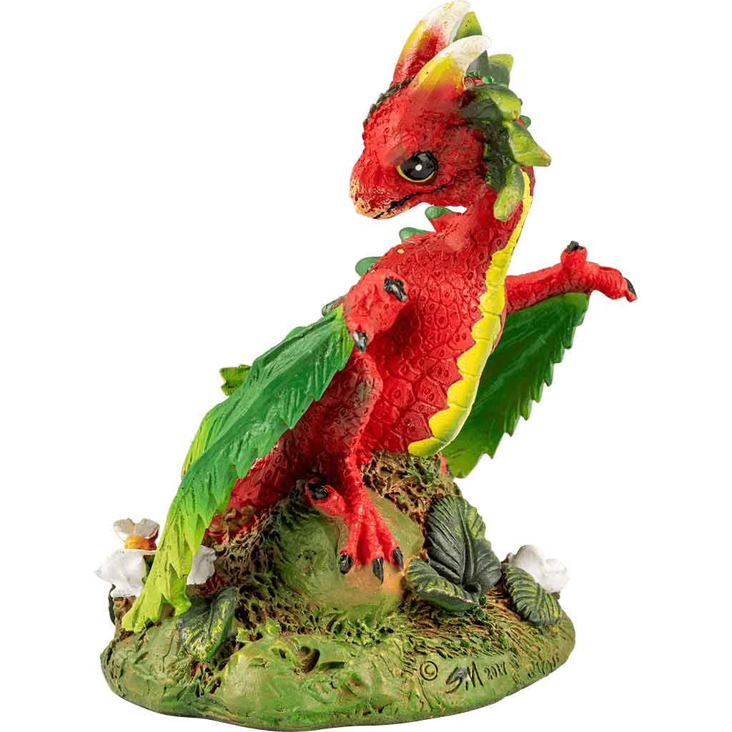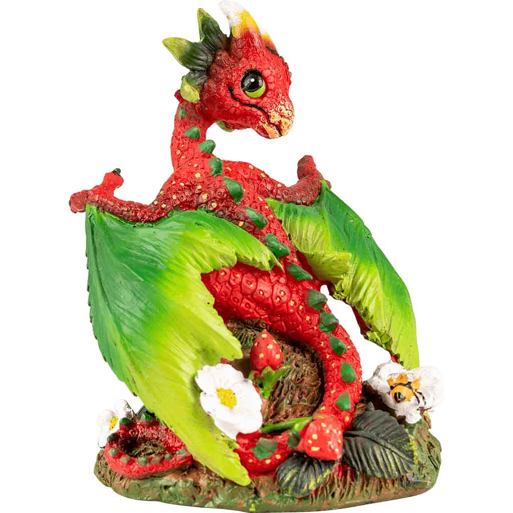 Perfectly happy in a strawberry patch, this baby dragon has a unique appearance that helps it look just like its favorite fruit. The Strawberry Dragon Statue depicts the dragon with red scales speckled to look like strawberry seeds. Made of high quality cold cast resin, this small dragon statue has been hand painted to reveal each unique detail. The dragon has green spines and wings that look like strawberry leaves, its face turned to glance over its back with bright green eyes. White strawberry blossoms and small strawberry fruit decorate the grassy textured base. A yellow and black bee perches on one of the flowers. Adorable and eye-catching in its fruit-inspired detail, this dragon fruit statue makes a unique addition to collections and home decor.