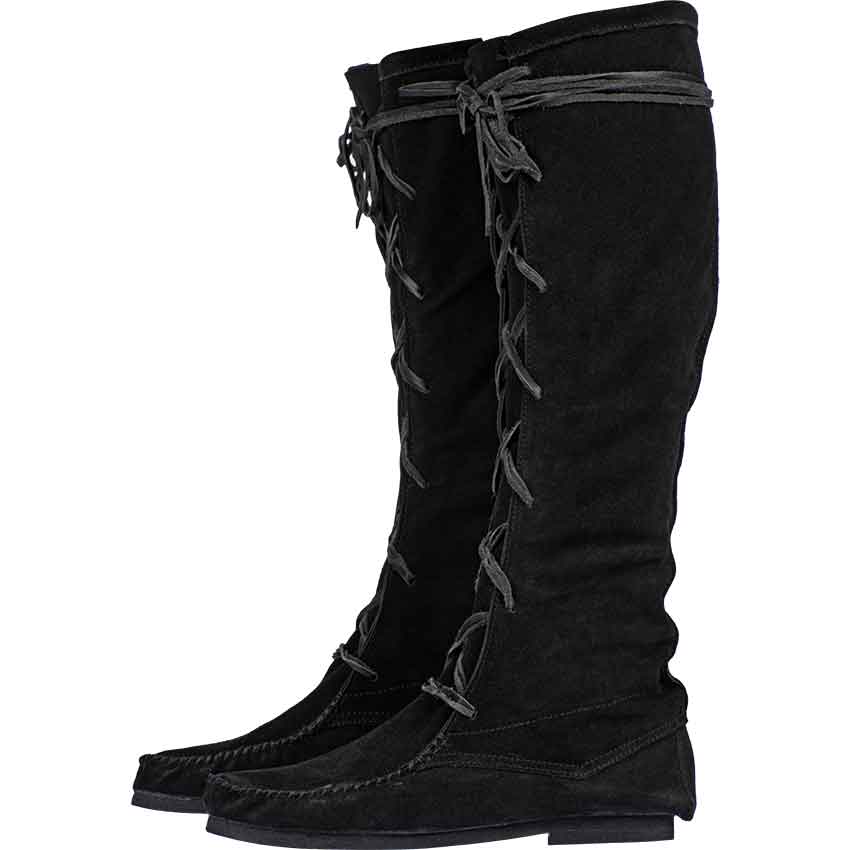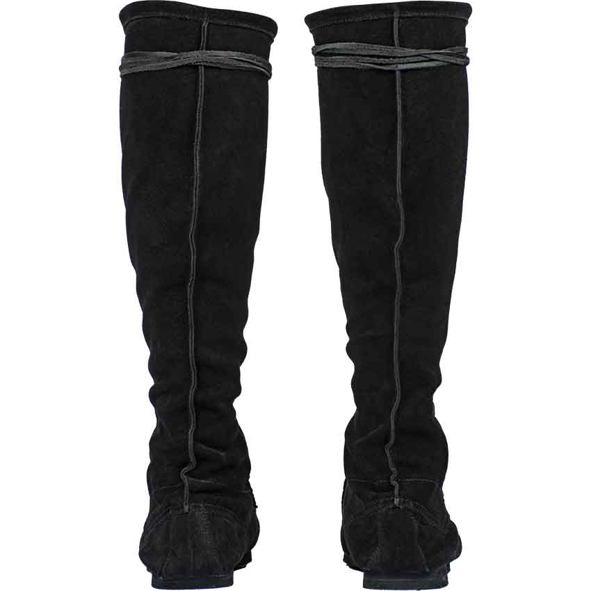 Whether you wish to become Robin Hood, a fantasy adventurer, or someone else, the black Suede Medieval High Boots are a great final touch. Made from suede, these black boots come in a range of sizes, allowing both men and women to wear them. They lace up in front and tie at the top of the boots. The boots end just below the knees. The boots have a slight heel. Wear these black suede boots to your next reenactment, faire, or roleplaying event.