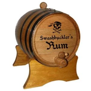Our oak barrels are perfect for the full time pirate who likes to do things the old way. These barrels are handcrafted from American White Oak. They also feature metal bands, which can be polished steel, blackened steel, or brass metal. This barrel has laser burned pirate font saying Swashbuckler’s Rum on the front of the barrel along with a skull and crossbones design. The barrel holds approximately 2 liters. All barrels have a medium toast and come with the stand, bung, and wooden spigot. It is perfect for aging Mead, Rum, Tequila, Brandy, Whiskey, Scotch, Bourbon, Cognac, or Wine Vinegar.