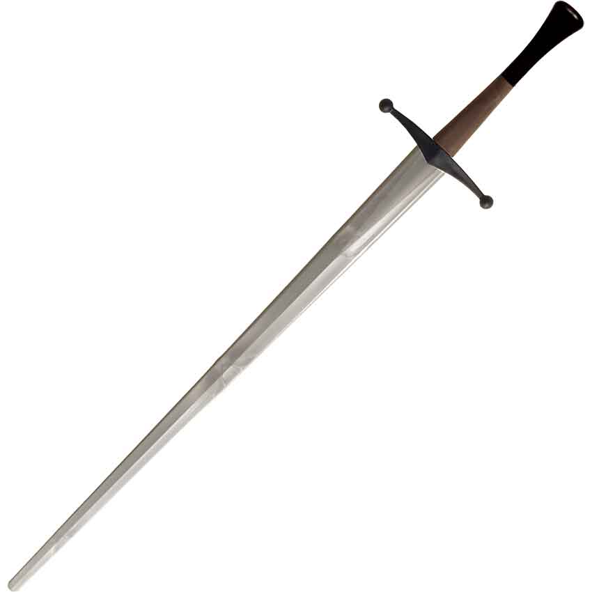 When sparring or practicing alone, be sure to use a sword that feels like a steel blade without the danger. Use the Silver Blade Synthetic Bastard Sparring Sword. Approved by the Boars Tooth Fighting School, this historically-inspired sword is meant for sparring and drilling. It features an extended pommel for additional torque and leverage. The longer scent stopper-shaped pommel also allows for two-handed use. This pommel is next to a brown grip. After the grip is a black crossguard. The crossguard has a ball-shaped cap on each arm. Next, the sword has a double-edged blade that flexes in the last third of its length near the rounded tip. This makes it safer for thrusting maneuvers than conventional wooden wasters. Whether you are a novice or an expert at sparring, the Silver Blade Synthetic Bastard Sparring Sword is always a great choice!
