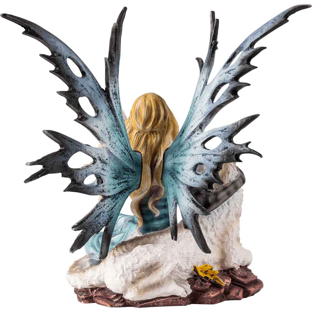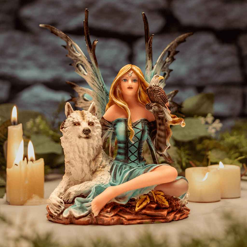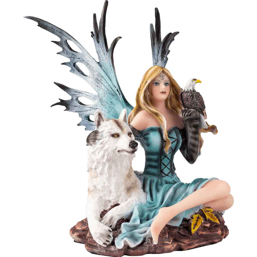 Fairies love to roam the wild and make friends with the animals. The fairy shown in the Teal Fairy with Wolf Statue has a couple of animal companions. Made of cold cast resin, this hand-painted statue features a fairy in a teal dress sitting down with matching wings. She holds a bald eagle on her left arm while she pets a white wolf with her right arm. A couple of autumn leaves adorn the ground below her legs. This beautiful statue makes a fantastic home decor piece for fairy enthusiasts.
