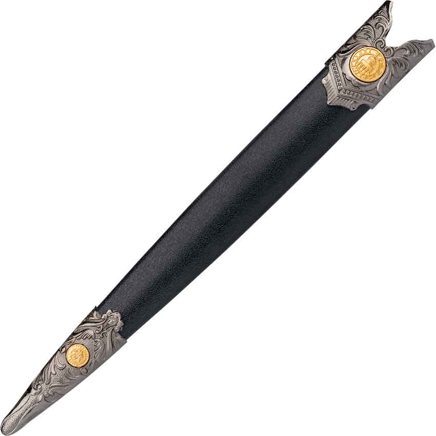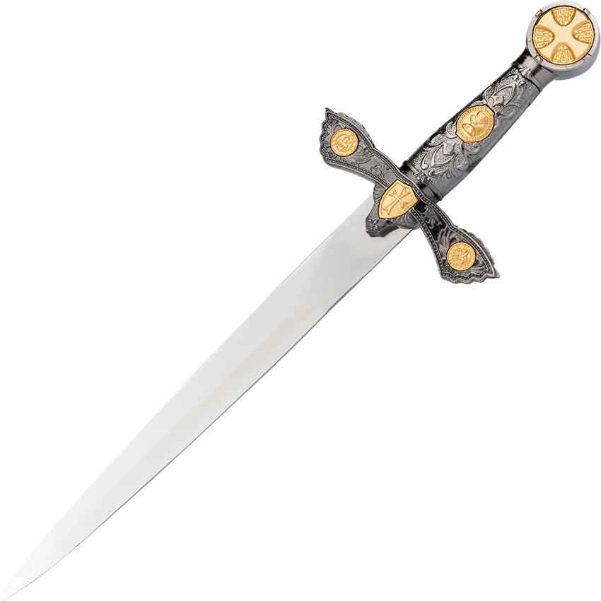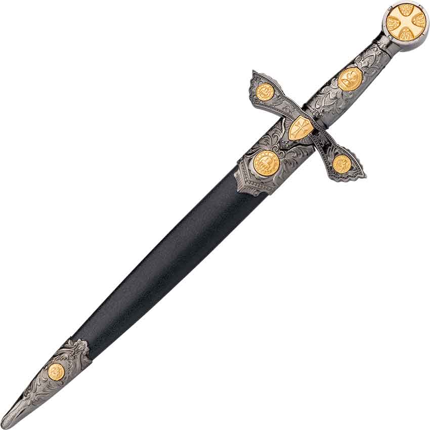 The Knights Templar is potentially the most famous group of warriors to have existed in the middle ages. They fought in the crusades as champions of the Catholic church and wielded weapons much like the Templar Icon Dagger! This ornate crusader dagger bears imagery that is innately linked to the Templar order, such as the Templar cross and the Holy Grail. The pommel of this blade is set with a large Templar cross coin, the handle is set with a coin that bears the image of the Holy Grail, and the crossguard is set with a shield-shaped coin with the Templar cross on it as well. All of these gold colored icons contrast beautifully with the dark metal of the hilt, which bears an intricate pattern. The scabbard that this stainless-steel blade slips into bears the same dark color as the hilt, with two more golden icons, one near where the blade enters, and a small one near the tip. Whether you add it to your personal collection or you give it as a gift to a friend or loved one who loves the crusades, you cannot go wrong with this collectors blade!