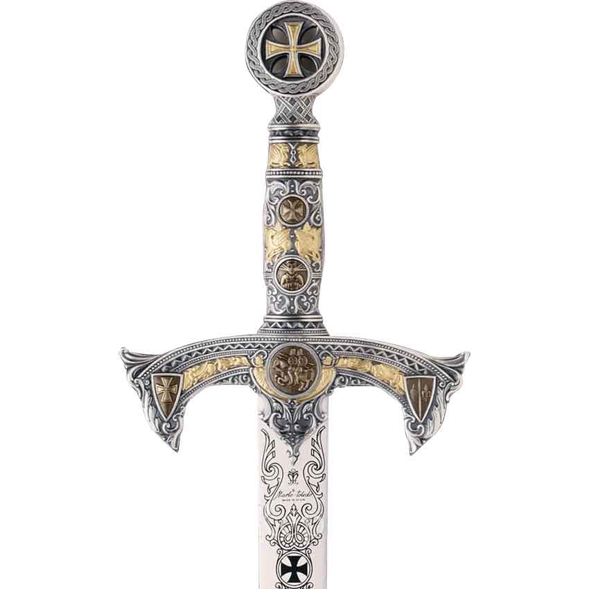 The Knights Templar began shortly after the First Crusade. Honor the long history of this intriguing brotherhood by possessing the Templars Sword. Made of 420 stainless steel, this sword features symbols associated with the mysterious group. On the ends of the handguard are two shields, including one with a Templar cross. The center of the handguard has the seal of the order. The grip and pommel both have a Templar cross. Intricate knotwork and engraving adorn the handle and crossguard. The blade continues the cross detail and intricate engraving around the Marto logo. It also has a diamond cross-section. This unsharpened sword looks fantastic decorating an office or as part of a costume.