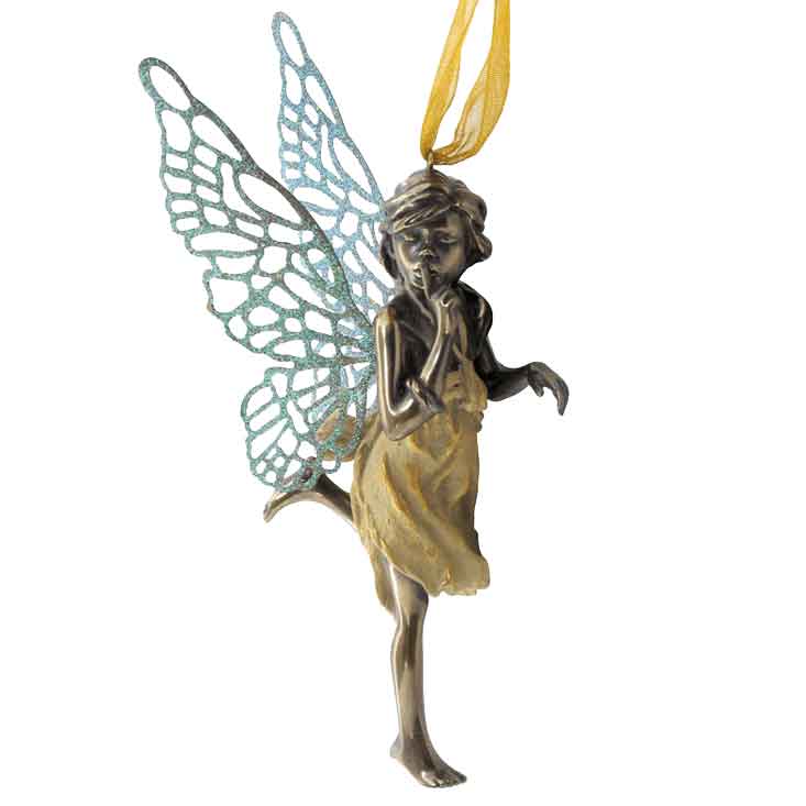Have you always longed to see fairies fluttering through the air? As rare as they are, now just such a sight can be captured and displayed in your home, thanks to The Fairies Hush Ornament, which recreates a pretty pixie in all her glory. Unlike her usual jovial and gleeful fairy friends, though, this fairy has learned that sometimes, silence is golden, and as such, holds a finger to lips in an attempt to shush all those around her. Her classic look is uniquely altered thanks to her polished bronze skin, while the yellow dress she wears accents her coloration while also complementing her youthful look. Adding to her beautiful design are her latticework wings that extend out from her back, which feature a verdigris finish that gives them a blue-green sparkle. This lovely ornament is crafted almost entirely in cold cast bronze, which is a form of cold cast resin that is mixed with powdered bronze to give the ornament a stunning finish similar to cast bronze metal. It is also hand painted, which both enhances its luster and its detailing. This fairy figurine stands approximately 5.5 inches tall, and it measures 2.75 inches long and 2.75 inches wide. Being an ornament, it comes complete with a yellow ribbon for easy and convenient hanging. Adorable in her design, The Fairies Hush Ornament makes for a great complement to any fairy theme or collection, as well as a fantastic little accessory to use when you decorate your little princess room.