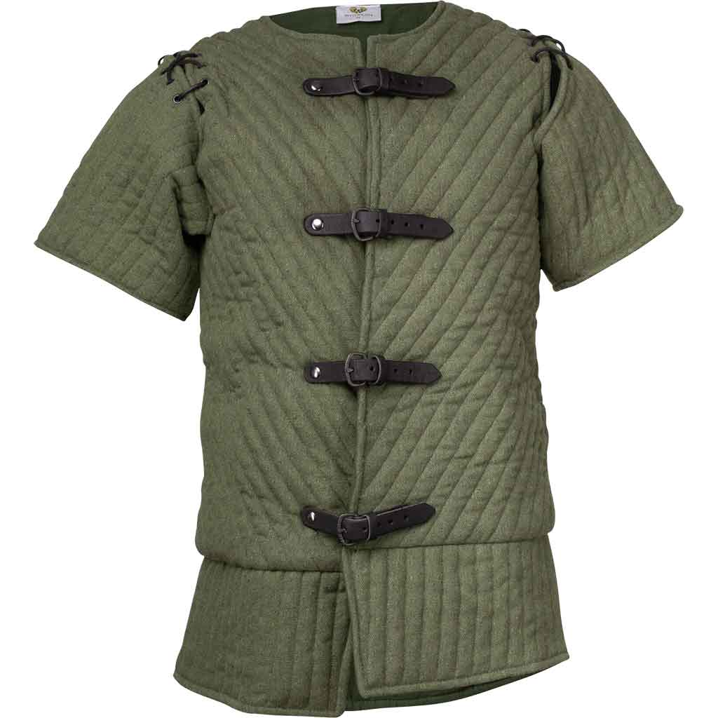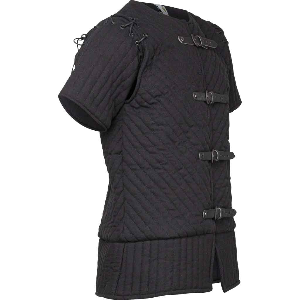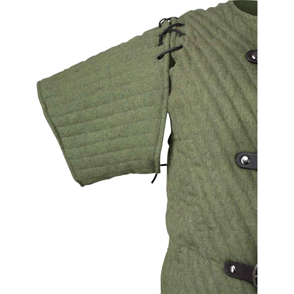Around the waist, this short gambeson then flares out slightly into two tails. These tails have a split in the middle for added mobility. When you wear this padded short sleeve gambeson, the tails cover the top of the thighs. Available in multiple sizes, this padded jacket accommodates a wide variety of figures. This ensures everyone can feel like they belong in the age of chivalry. There are two colors available for this arming jacket: Black and Olive. This allows you to choose the color that matches your harness or outfit. Please note that this handmade LARP gambeson is made from natural materials, and the color may vary.