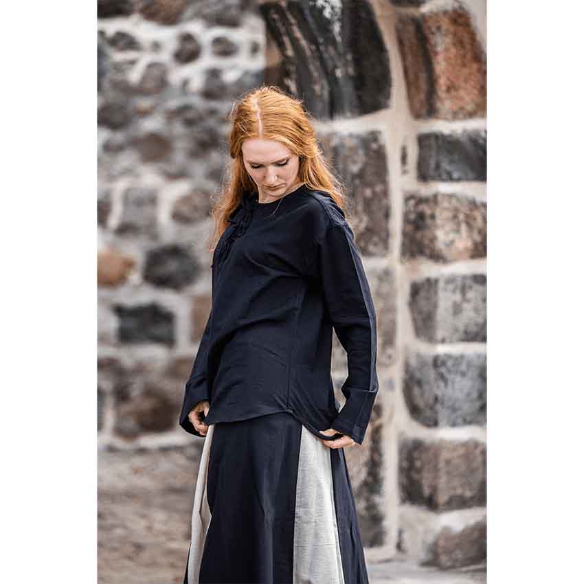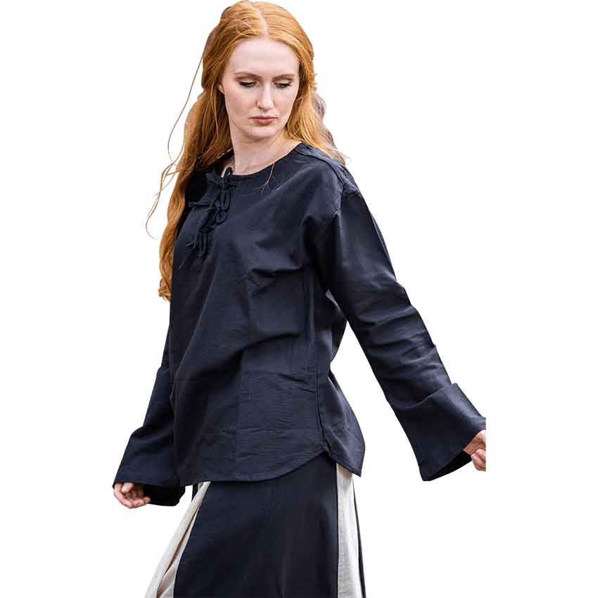 Crafted from pure cotton, this medieval blouse is a comfortable companion for your adventures. Starting with the design, this Tilda blouse has long sleeves for added style without sacrificing elegance or ease of wear. This blouse is a black color, providing a sophisticated look. There are three sets of fabric ties at the round neckline. These fabric ties can be secured based on your preferred look, giving you another layer of detail to appreciate.
