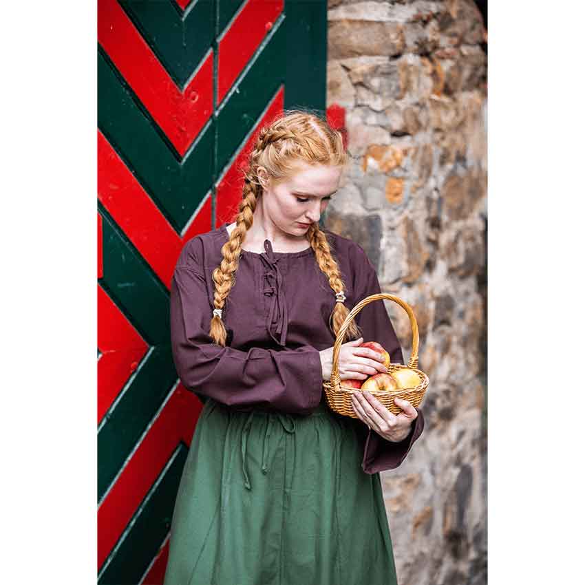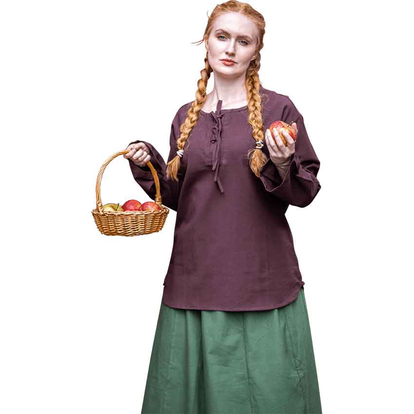 Crafted from pure cotton, this medieval blouse is a comfortable companion for your adventures. Starting with the design, this Tilda blouse has long sleeves for added style without sacrificing elegance or ease of wear. This blouse is a brown color, providing a natural, earthy look. There are three sets of fabric ties at the round neckline. These fabric ties can be secured based on your preferred look, giving you another layer of detail to appreciate.