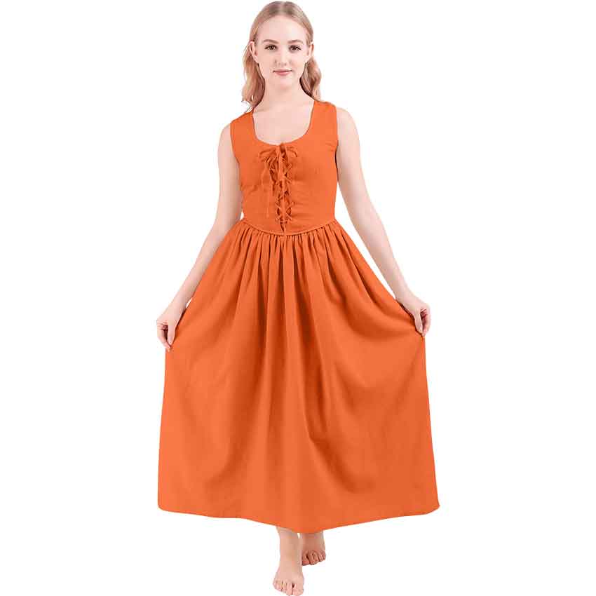Two deep pockets are on either side of the dress. This medieval dress has a waistline that gathers the fabric all the way around for added detail and fullness. The silhouette is inspired by historical European designs. Its tailored silhouette and front lacing give you a flattering fit.