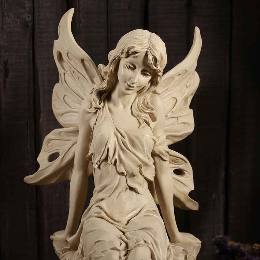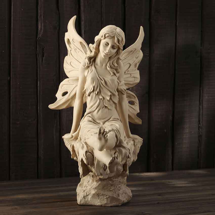The Twinkle Toe Butterfly Fairy Statue is a way to bring some truly magical style and a fantastic impact to any space. Made from polystone, this hand-painted fairy decor piece features a thoughtful fairy sitting on a stone boulder. The fairy stretches out her legs as she looks down at a butterfly resting near her toes. She wears a sleeveless dress that drapes across her body. Her butterfly wings flutter behind her. This cream-colored fantasy statue makes a great addition to any fairy collection or fantasy home decor. You can also give the fairy statue as a gift.