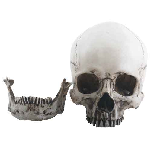 Alas, poor Yorick! This human skull replica makes a macabre decoration for your home that looks so realistic it may give guests a fright. The Two Piece Skull Head separates at the jaw, allowing you various ways to display it. The top of the skull rests easily on the jaw or can be shown on its own. This skull head features suture lines and blackened details that help provide dimension and authenticity to its appearance. At over seven inches long, this skull statue makes a fantastic life-size replica for the stage or haunted houses. It is a great piece to display around Halloween or any time of year you want to add a touch of gothic style to your decor.