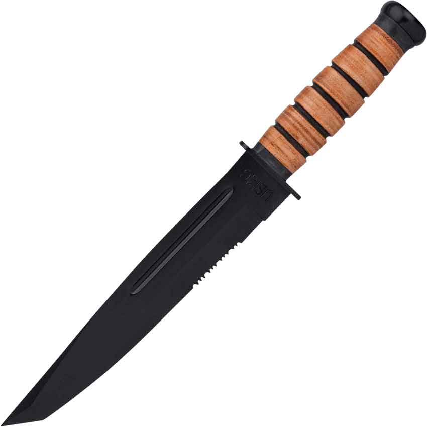 The blade has an all-black design. Near the base of the bottom edge, there is a small, serrated section. Above the serrated section, there is a fuller that runs down half the length of the blade. The letters USMC adorn the base of the blade.