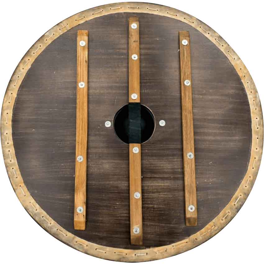 Three sturdy wooden bars are riveted behind the shield for reinforcement. The center bar has a leather-wrapped grip offering you a secure hold.