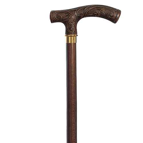 This Victorian Walking Cane is a classic take on the locomotive accessory, featuring intrinsic detailing as well as substantial strength that makes it a stellar accessory for anyone to have, whether they want support, style, or both. This cane features a traditional fritz style handle that is engraved and decorated with intricate twist and turns, creating a lovely scrollwork design. The cane also features a polished brass neck and a matching hardwood shaft that accents the wood-grain of the handle and provides a stable form of support that anyone can benefit from. The cane measures approximately 36 inches long, while the fritz handle provides a bit more support and comfort. Those in need of greater support when they walk are sure to love this Victorian Walking Cane not just because of the support it offers, but because of the stylish look that it contributes when used, too.