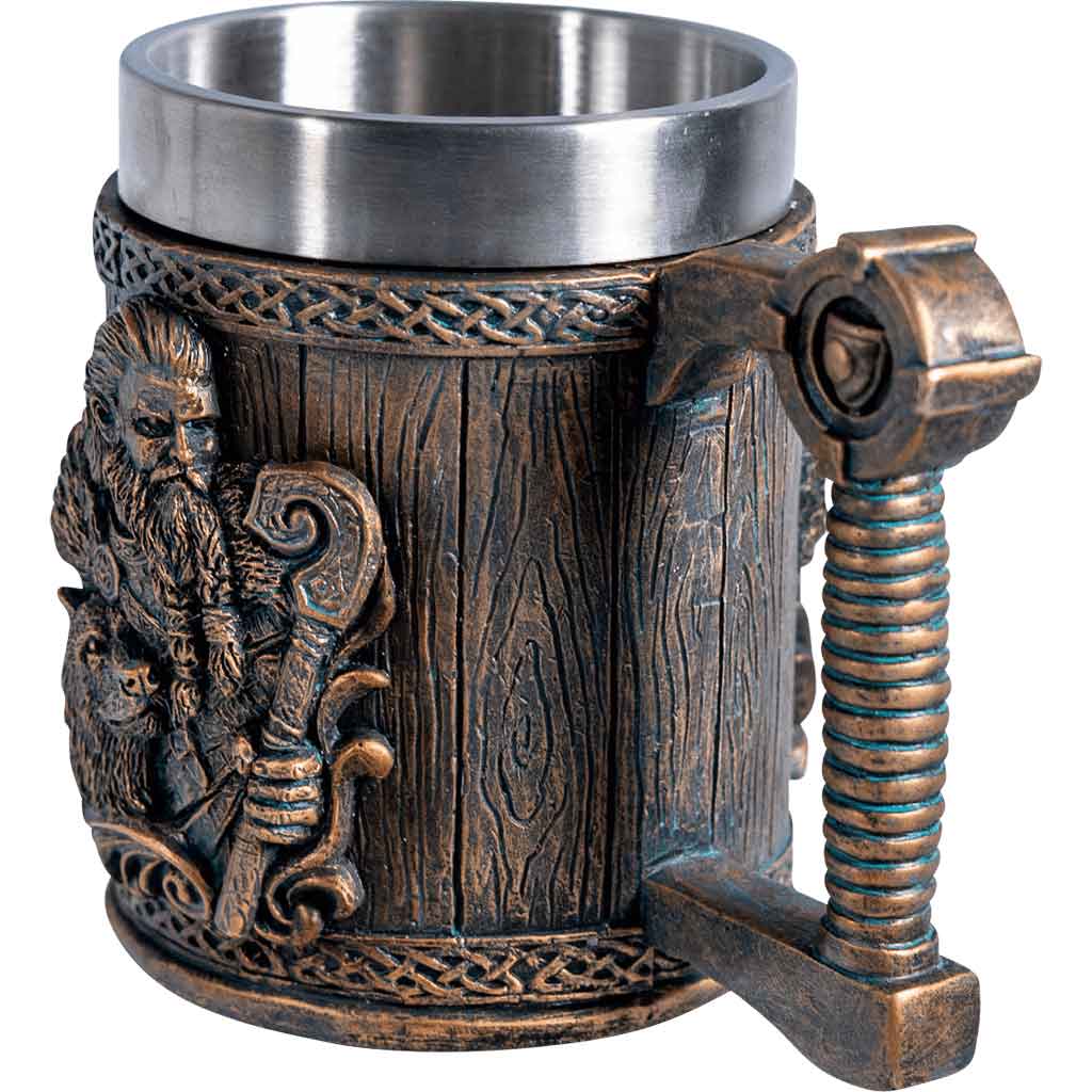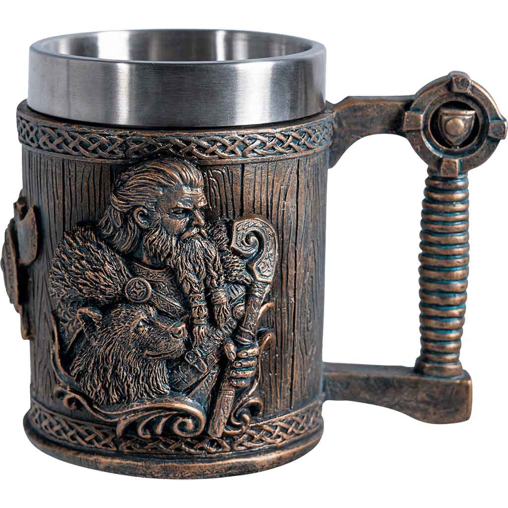 Raise a toast to the sagas of Norse warriors and your love of coffee with this Viking mug. The inside of the mug is stainless steel, allowing you to enjoy your favorite beverages with a hint of Viking style. Surrounding the stainless steel insert are intricately sculpted and painted details made from cold-cast resin. Cold-cast resin is a composite of powdered metal mixed with resin to create a sculpture that is lightweight and painted to resemble carved oak wood.