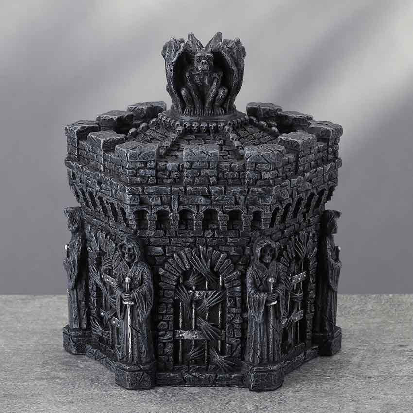 Behold the Warden of Souls Trinket Box, serving as both a guardian for your treasures and a statement piece for your gothic home decor. Crafted from polystone, this gothic trinket box boasts a hand-painted grey finish that evokes the mysterious allure of ancient castles. Its hexagonal design mimics a six-sided tower. The removable lid forms the crenelations and roof that crown this dark fortress.