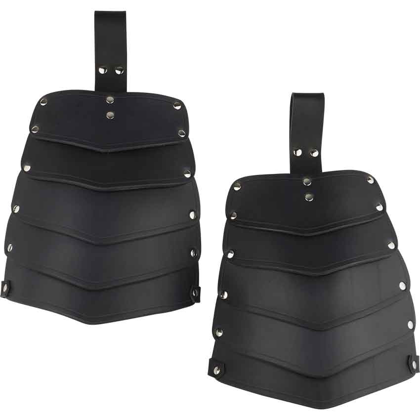 Displaying 5 overlapping plates that gradually increase in width, these Warriors Leather Tassets are available in several colors to coordinate with your battle kit. The heavy leather construction will protect your upper legs. Hand crafted in our shop from 13/15 ounce leather, these tassets are finished with steel or antique brass hardware. Each leather tasset has a loop to hang from your belt or cuirass and a buckled strap to secure it around your thigh. Perfect for SCA, LARP, or theatrical combat, these Warriors Leather Tassets are comfortable to wear with an understated style that will work for many different personas.